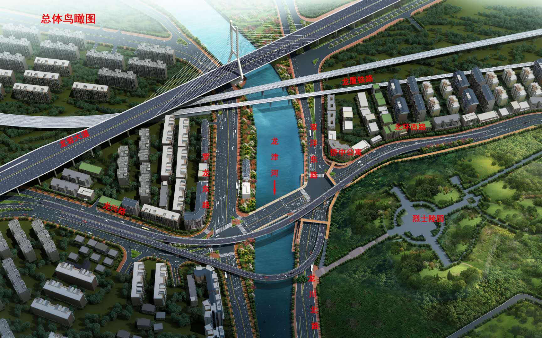 沿北環西路、龍興路設置南北分離式雙向四車道高架,南側接龍興路,北側接現狀北環西路,高架靠東側布置(緊貼烈士陵園),橋梁總長約1140米,凈寬約7.7米;在雙洋路、龍川北路、北環西路設置人行天橋,與山體步道銜接,以完善慢行系統;在烈士陵園山體下采用明挖回填方式設置框涵,長度約225米,凈寬10.75米。