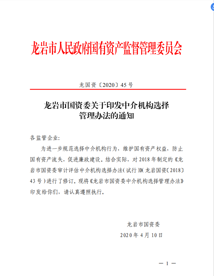 龍巖市國資委關于印發中介機構選擇管理辦法的通知(龍國資[2020]45號)
